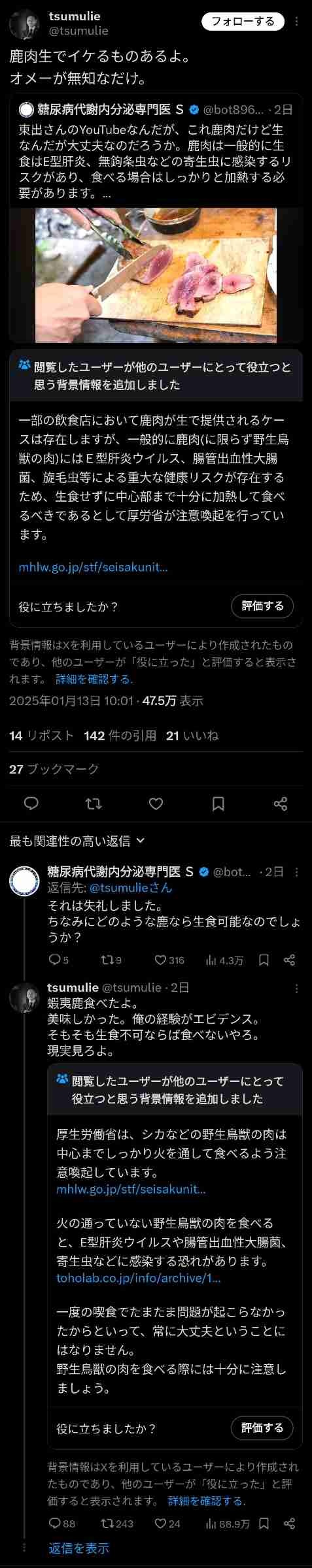 医者「鹿肉の生食は危険」馬鹿「生食できるぞ、ソースは俺が食べたことあるから」