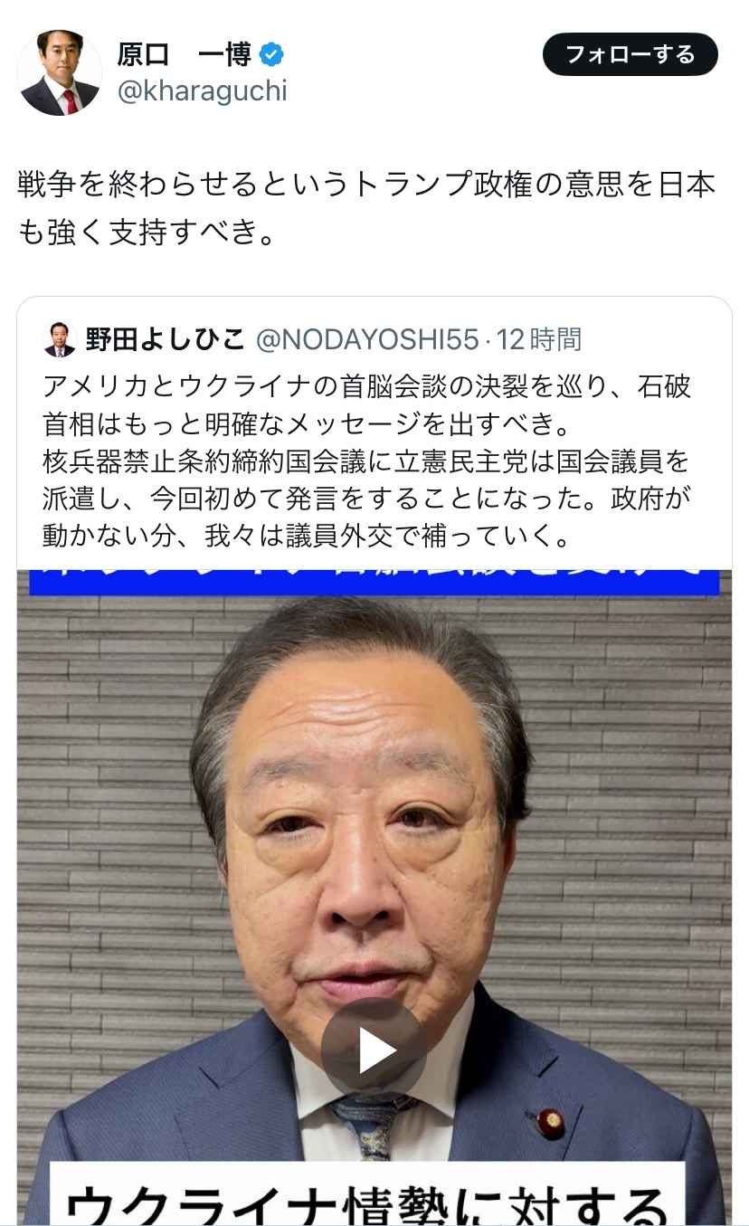 原口一博さん、野田佳彦に直訴「立憲民主党はトランプを支持するメッセージを出すべきである」