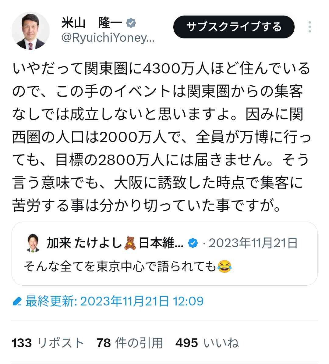 去年の論破王米山「関西人が全員万博見に行っても2000万人です、このイベントは成立しません。左様なら」