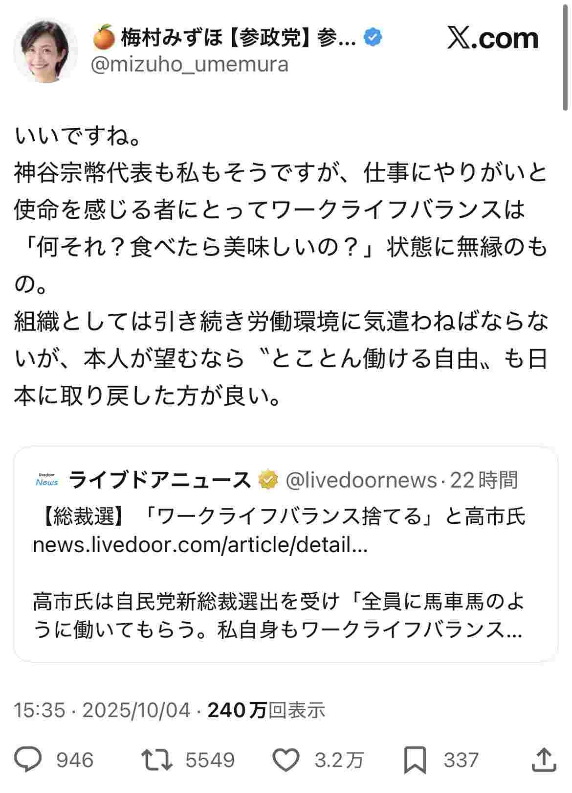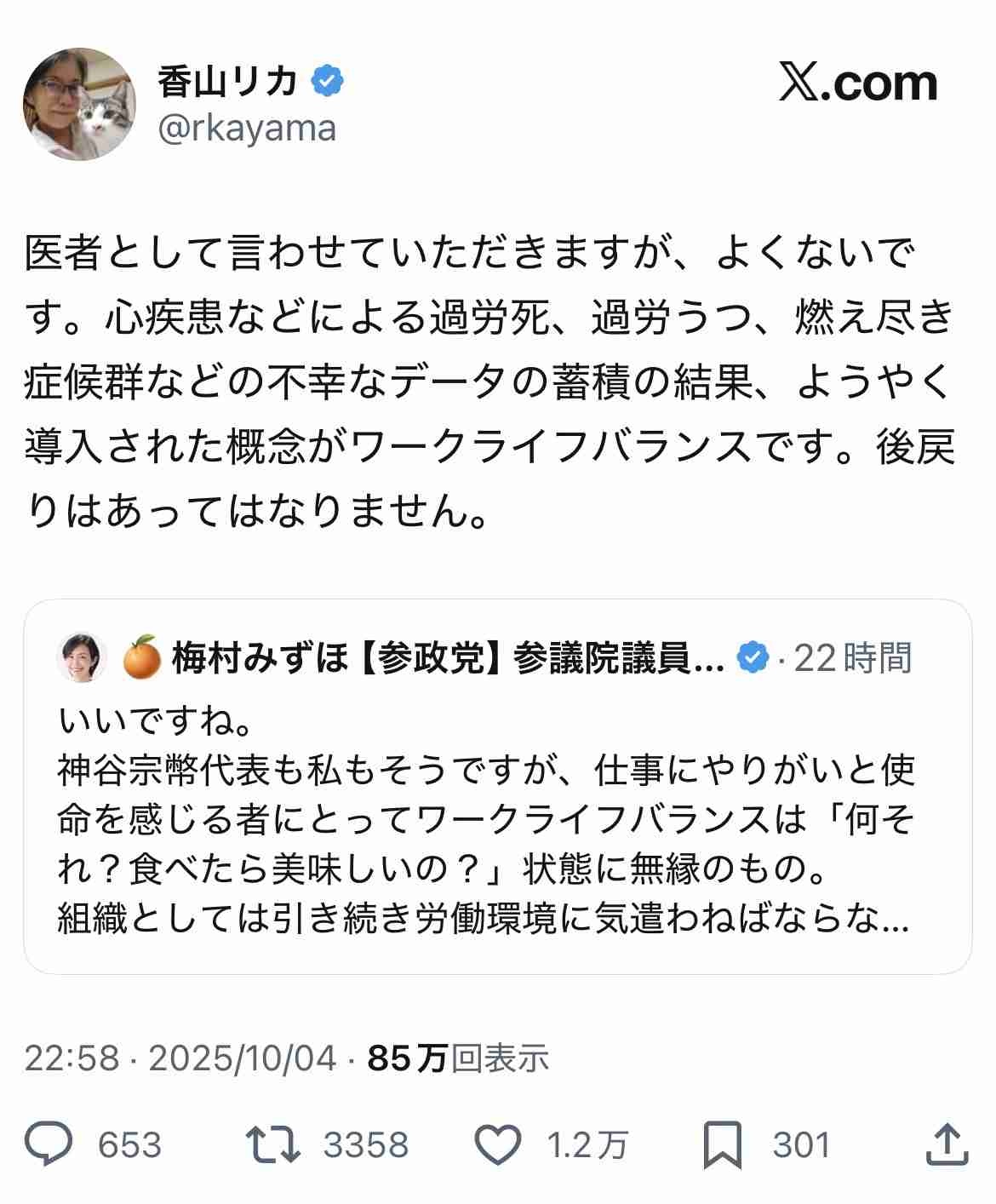 参政党議員「ライフワークバランス?何それおいしいの?」香山リカし「医者として言います。ライフワークバランスを捨てるのは良くない」