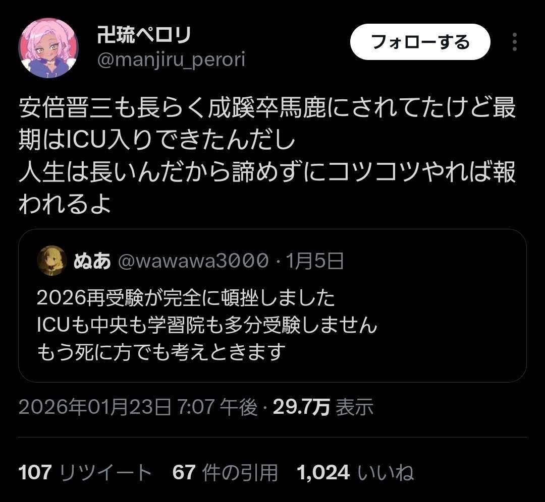 受験生「ICU諦めます死にます」 (ヽ´ん`)「成蹊卒安倍晋三も最期ICU入りしたから諦るな」→ケンモメンが袋叩きに遭ってしまう