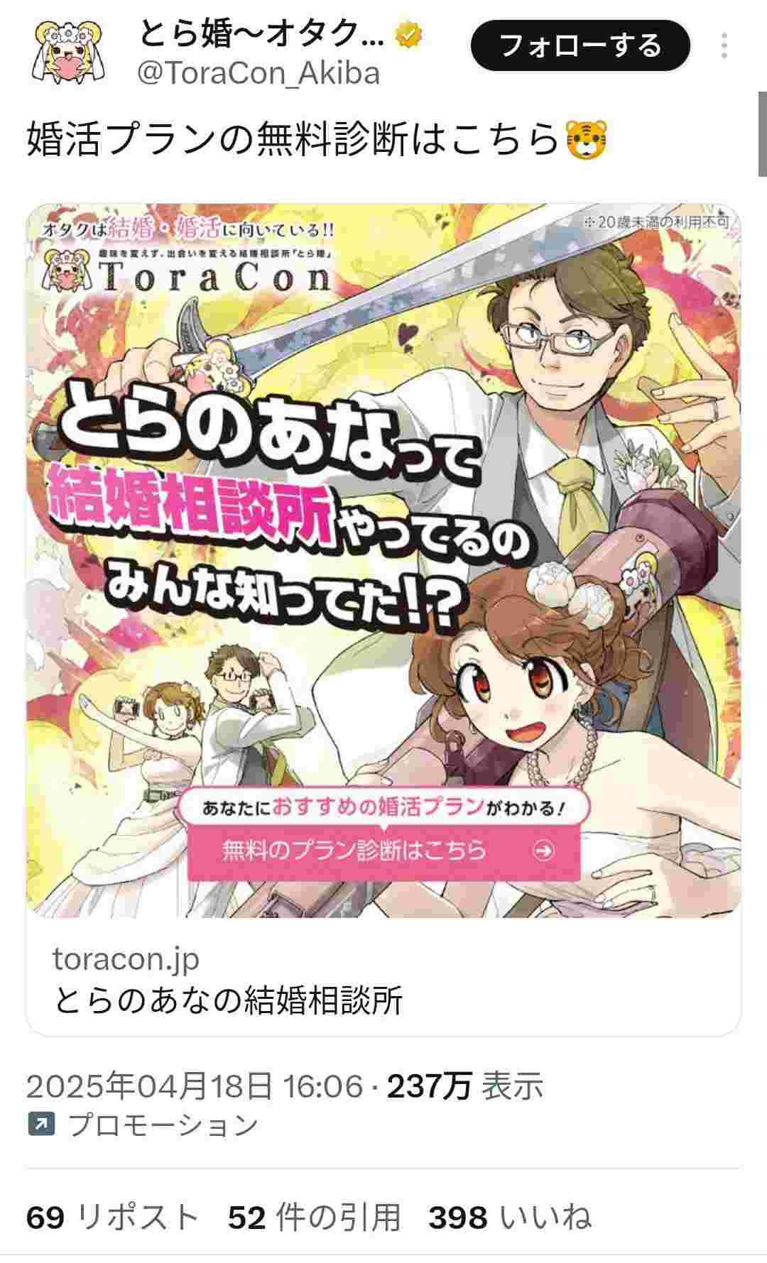 オタク婚活の「とら婚」が成婚者数2,000名突破!記念キャンペーン&記念イベントの開催が決定!Release No.2324865|(C)とら婚 アニメや漫画・ゲームなど趣味をこよなく愛するオタク層向けに特化した結婚相談サービスとら婚(以下、とら婚)は、2025年5月にとら婚会員の成婚者数が2,000名を突破しました。これを記念し、...www.oricon.co.jp - 2 : 2025/07/07(月) 20:51:42.37 ID:CkqCPoih00707