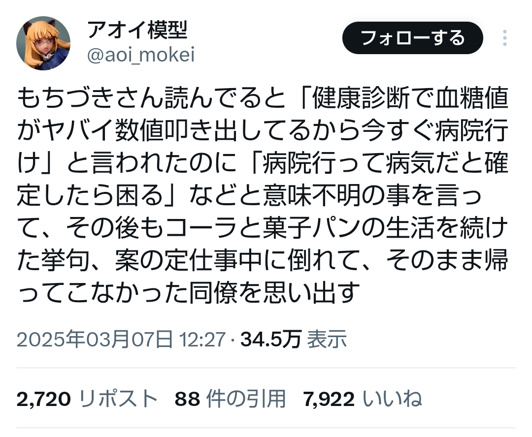トガ食い、大酒、ヘビースモーカーの三冠王だった同僚は30代で大腸癌で他界した