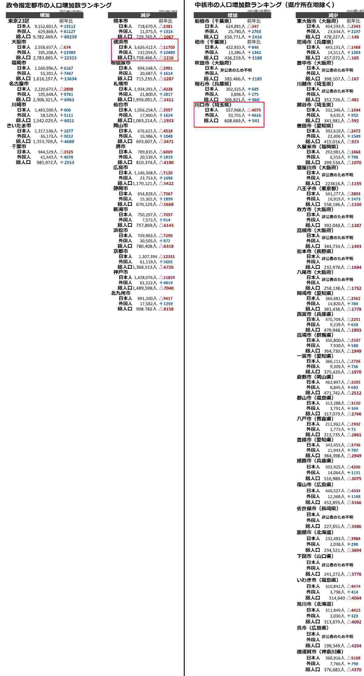 福岡市と名古屋市の日本人人口増加率は3倍、4倍以上のえげつない差が付いてるね