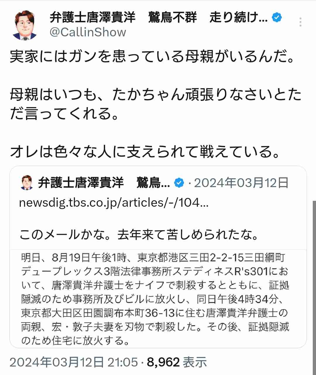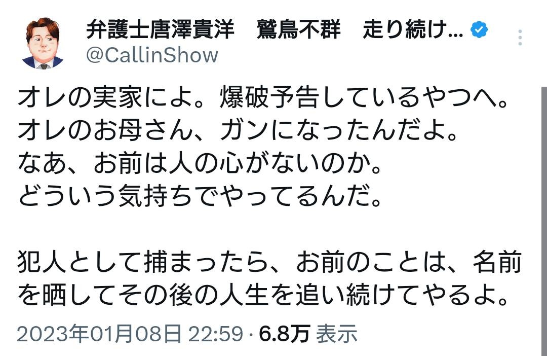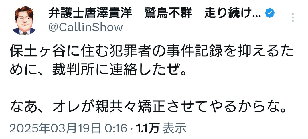 > … また、「炎上弁護士」として有名な唐澤貴洋さんにもご紹介いただきました。正義感あるすてきなかたでした。 - 20 : 2025/04/01(火) 23:56:21.680 ID:PkjBUdYyZ