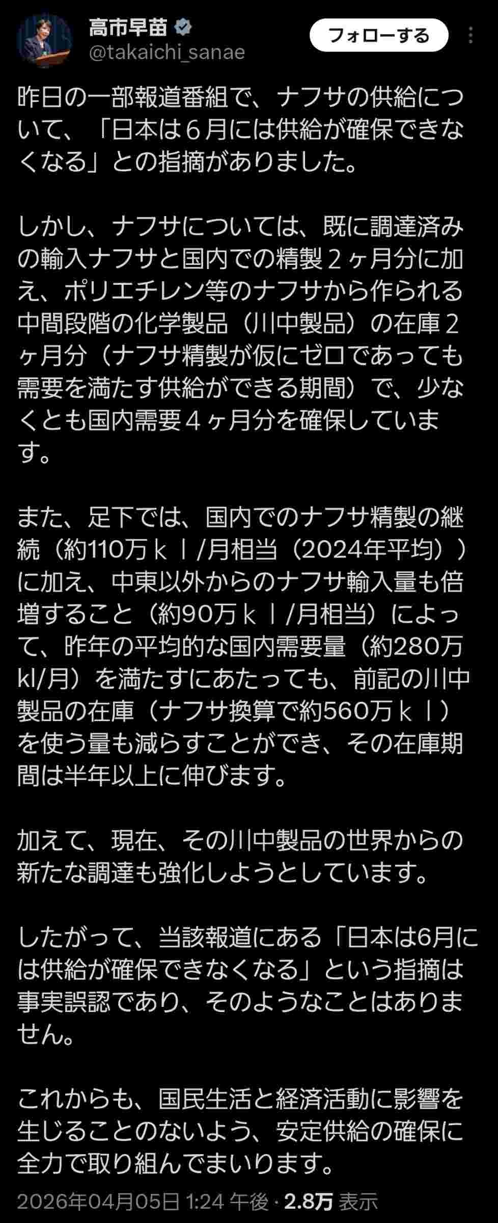 【悲報】高市、報道特集のナフサ危機報道に慌てて否定ポスト😳ナフサはポリ製品だけに使われるもんじゃなくないか