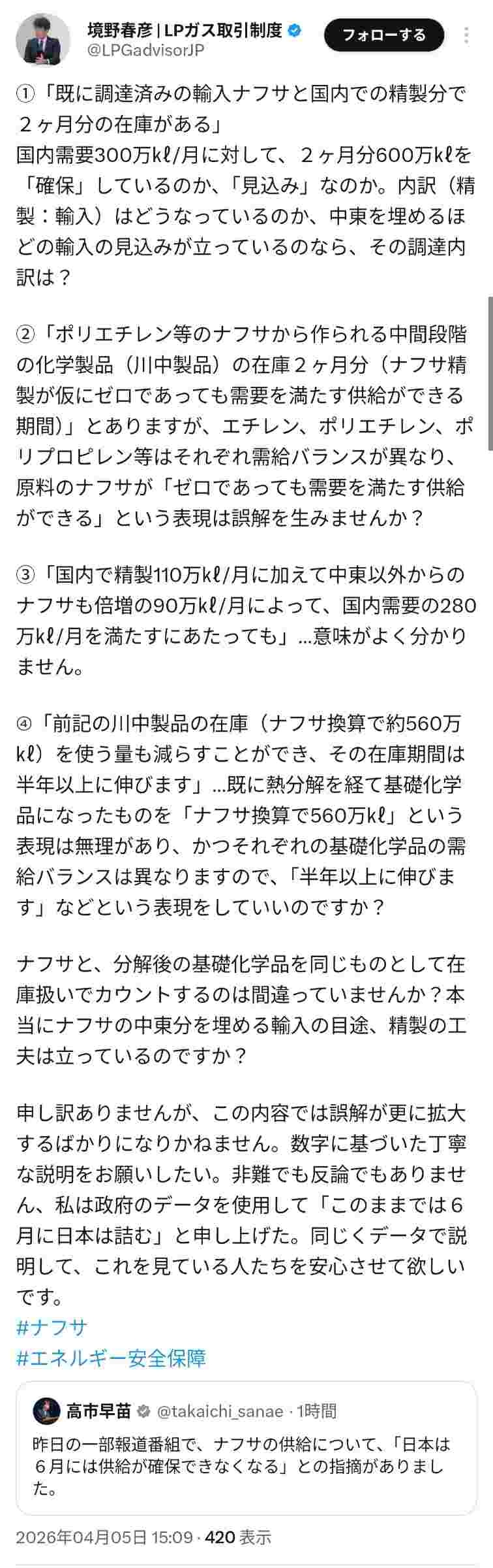 ナフサと、分解後の基礎化学品を同じものとして在庫扱いでカウントするのは間違っていませんか?本当にナフサの中東分を埋める輸入の目途、精製の工夫は立っているのですか?