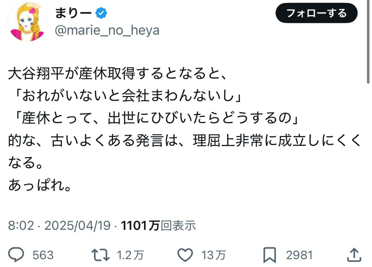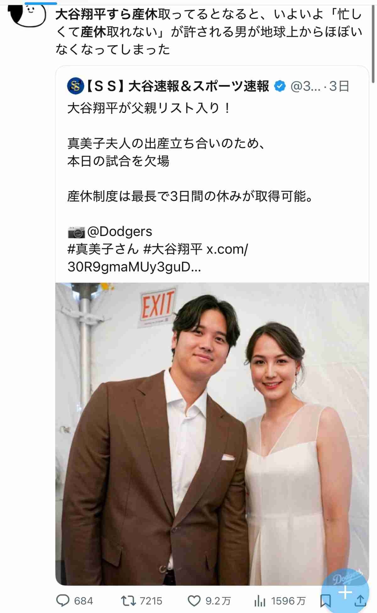 大谷の産休は褒められるけどワイらの産休を褒めてくれる人なんていないよね