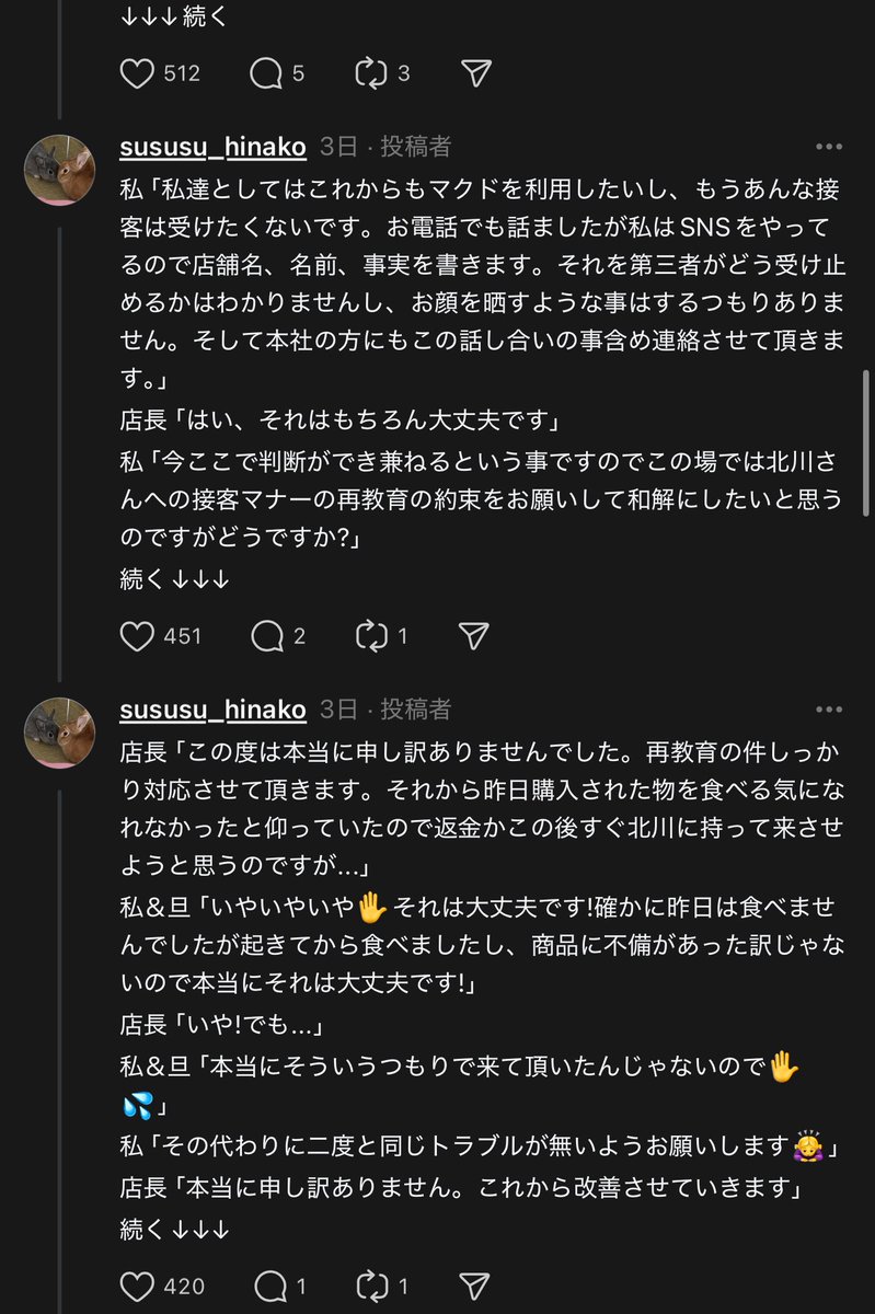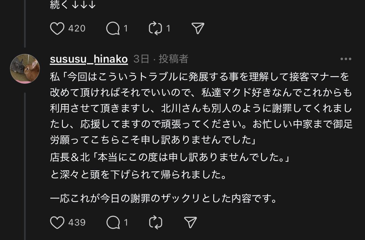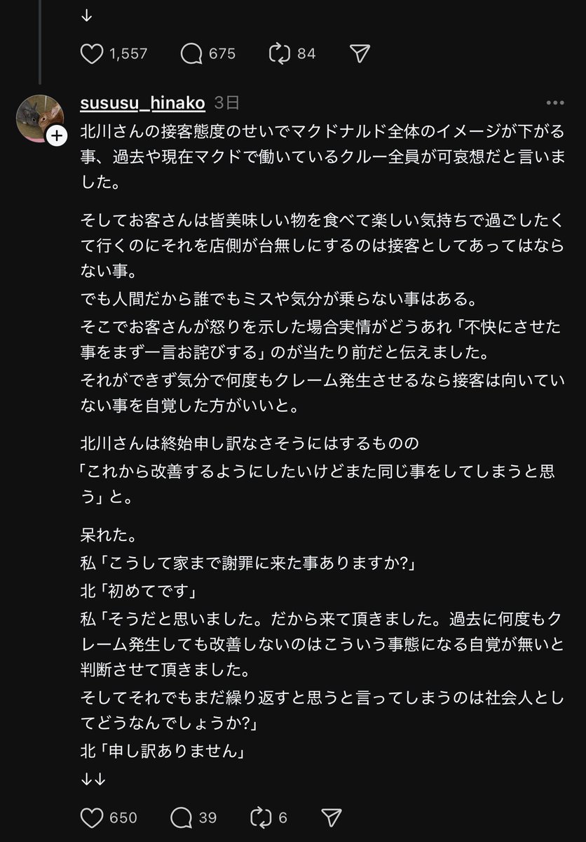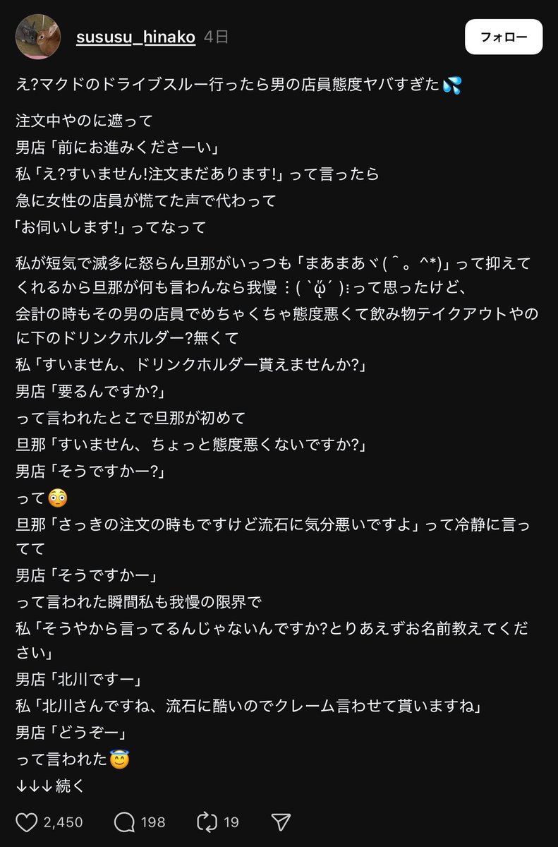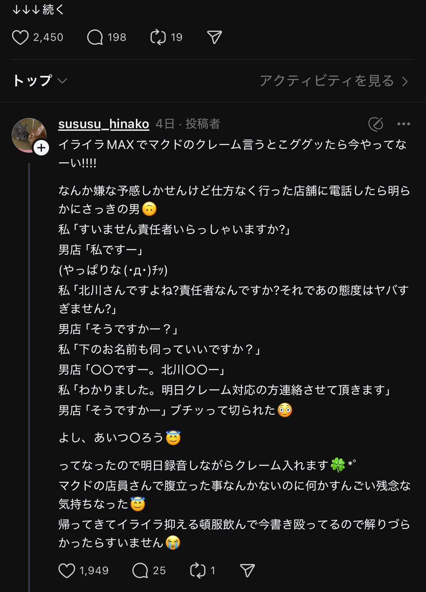 マクドナルドのイメージが下がる事を懸念してクレームを入れる神客