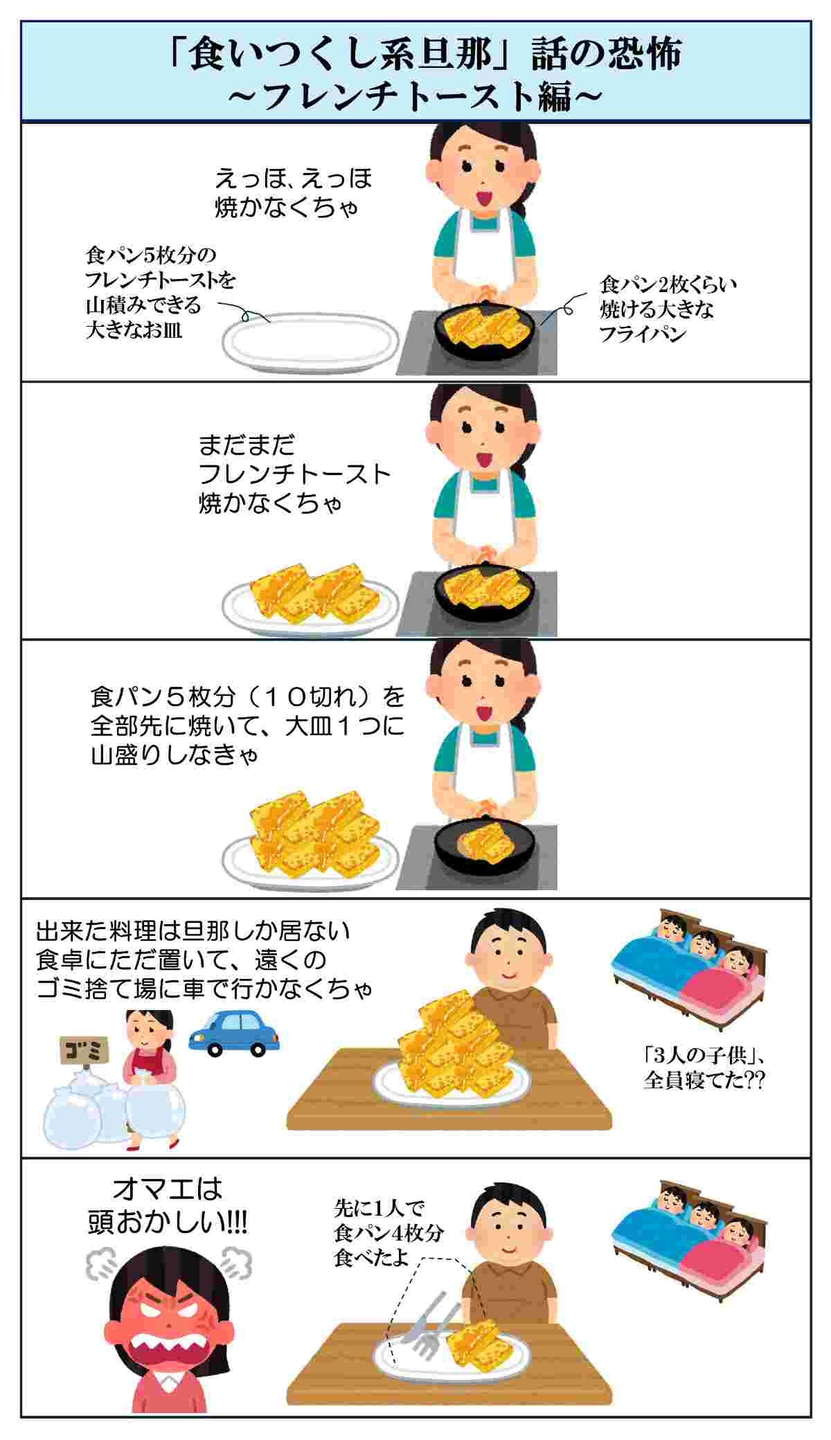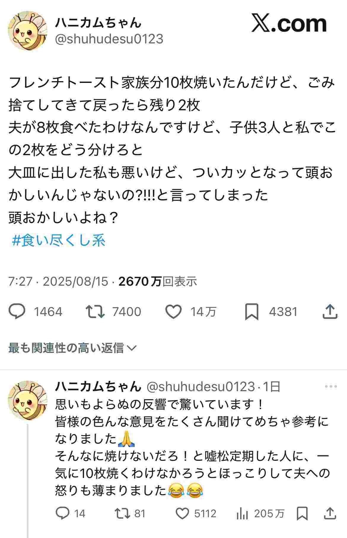 女「フレンチトースト10枚焼いたら夫に8枚も食われた😡」←嘘松と叩かれまくって垢削除