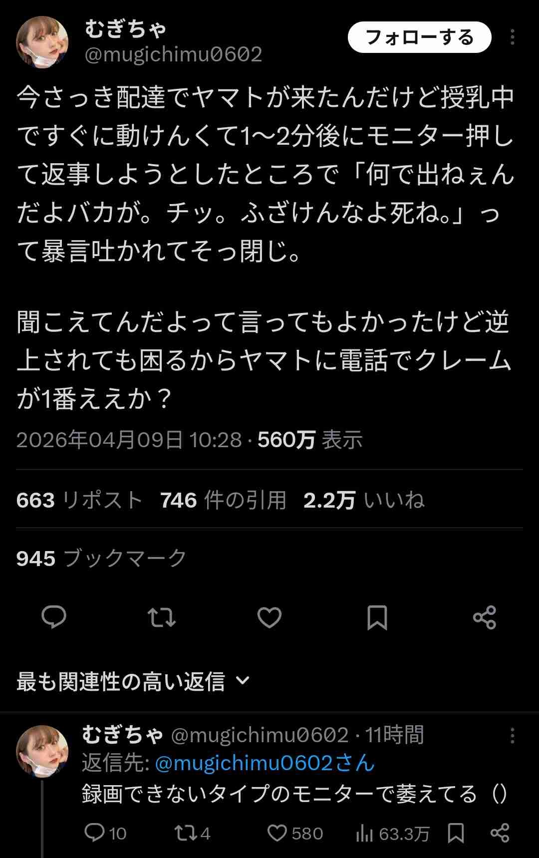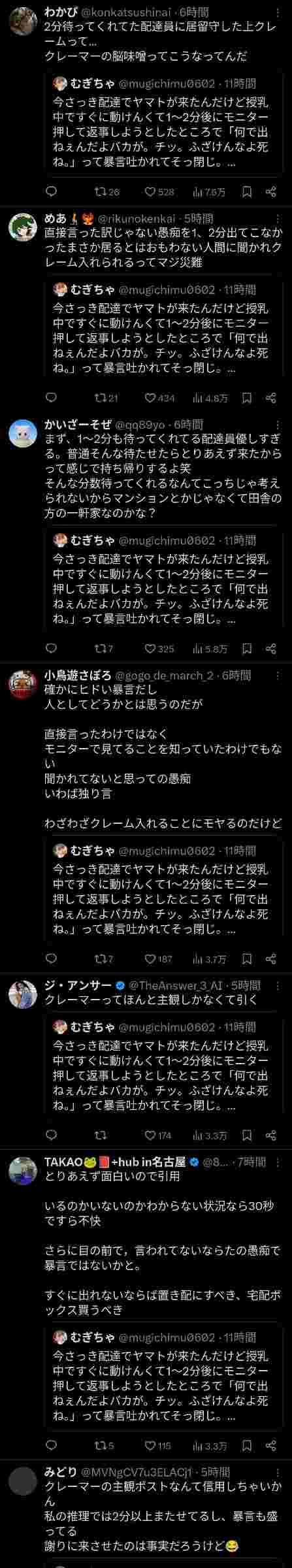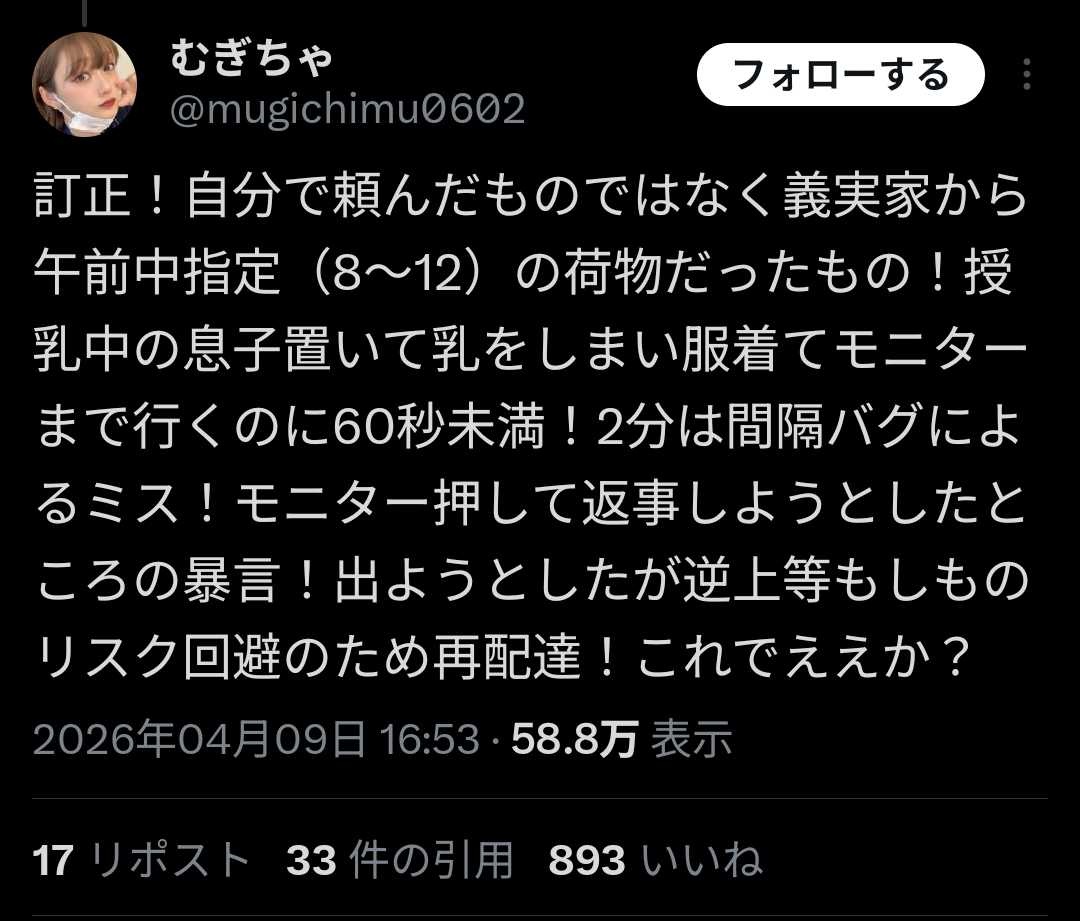 女「授乳中に宅急便来たから2分後インターホン付けたら『ふざけんな』って暴言吐かれた。本社にクレーム入れよ」→大炎上