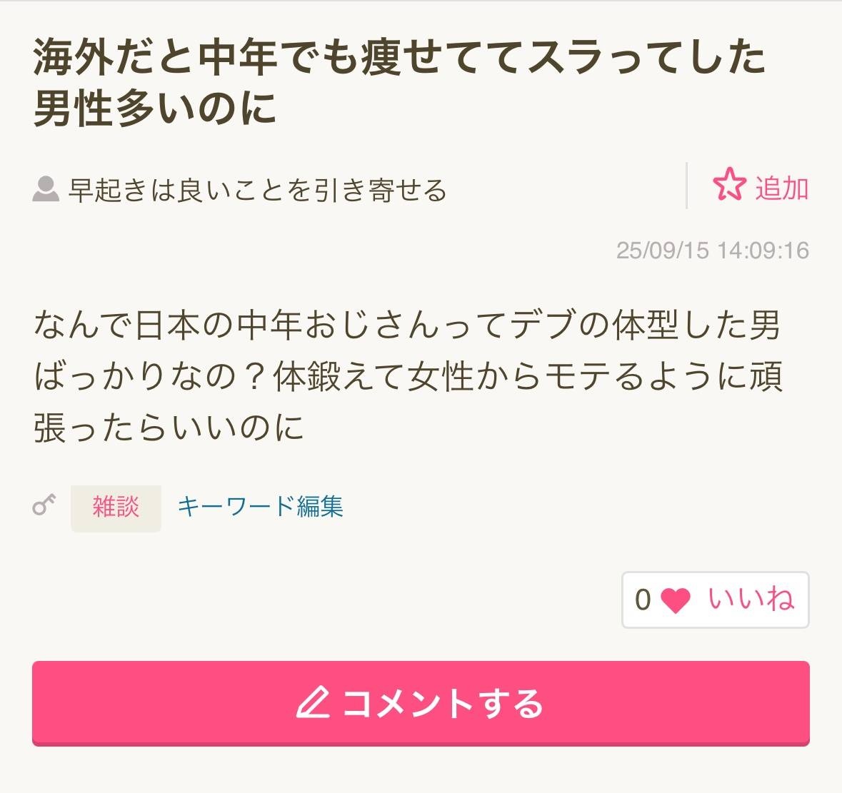女さん、正論「なんで日本人男性って中年になったら気持ち悪いデブの豚丼男性になるの?海外では痩せててかっこいい人が多いのに」