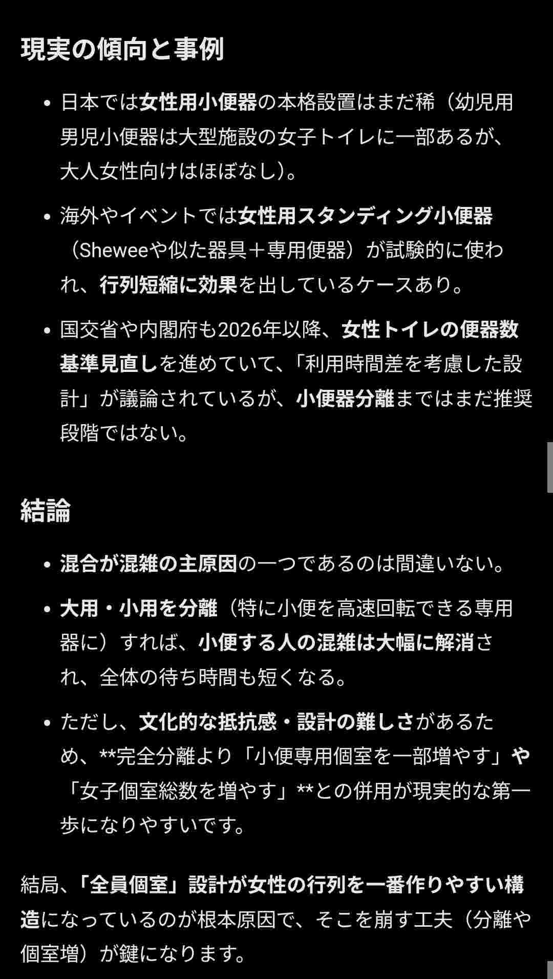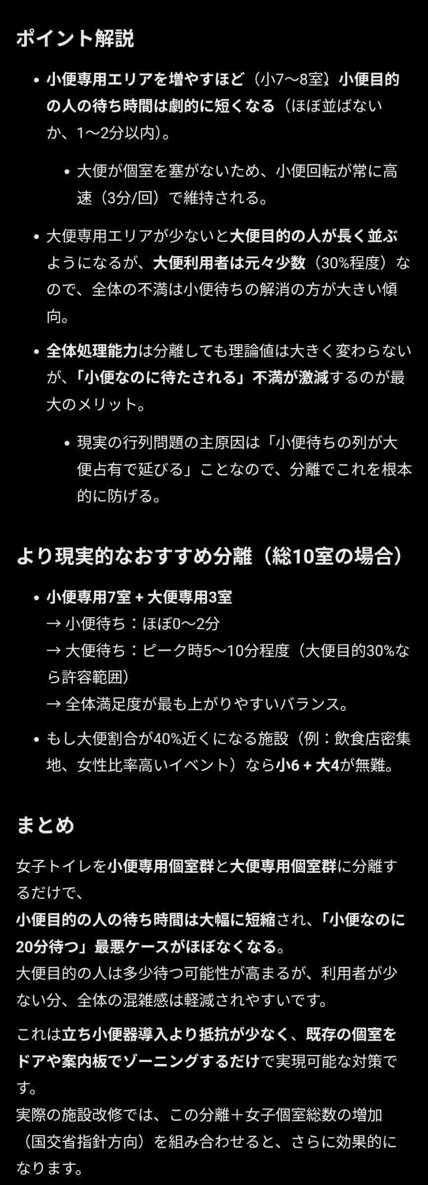 男子トイレを削って女子トイレの便器を増やすとおしっこするだけの男性も無駄に待つことになりナンセンスなので女子トイレの構造改革をするほうが現実的である