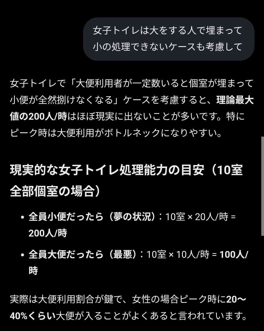 実際女子トイレは40%がうんこ女子で占有されてることが判明つまり残りの60%のトイレで小便を回さなきゃいけなくなるため壊滅的な混雑が発生