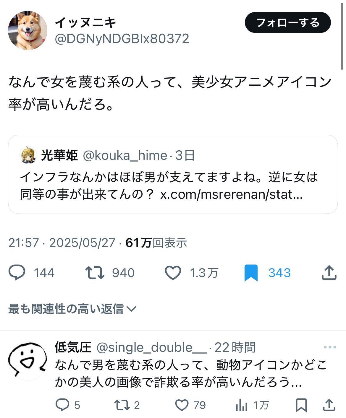 女性「女叩きアカウントってなんでみんなアニメアイコンなの?😅」