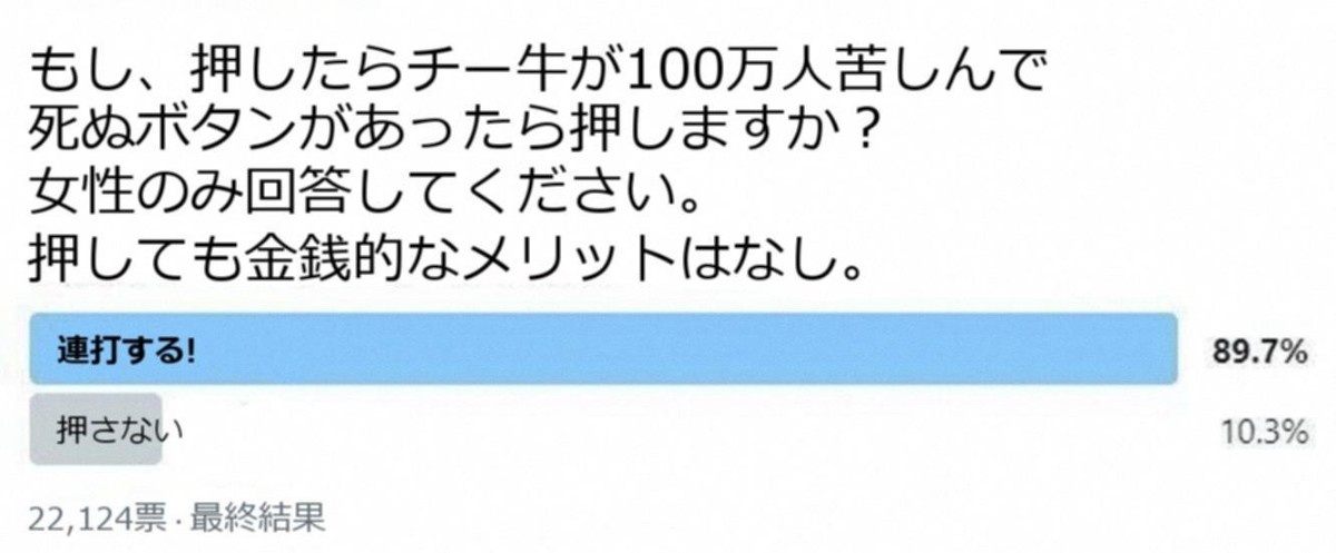 女性「女性の方に質問です。チ、ー、午100万人が苦しんで死ぬボタンがあったら押しますか?なお金銭的なメリットはありません。」→9割が押すと回答してしまうwww