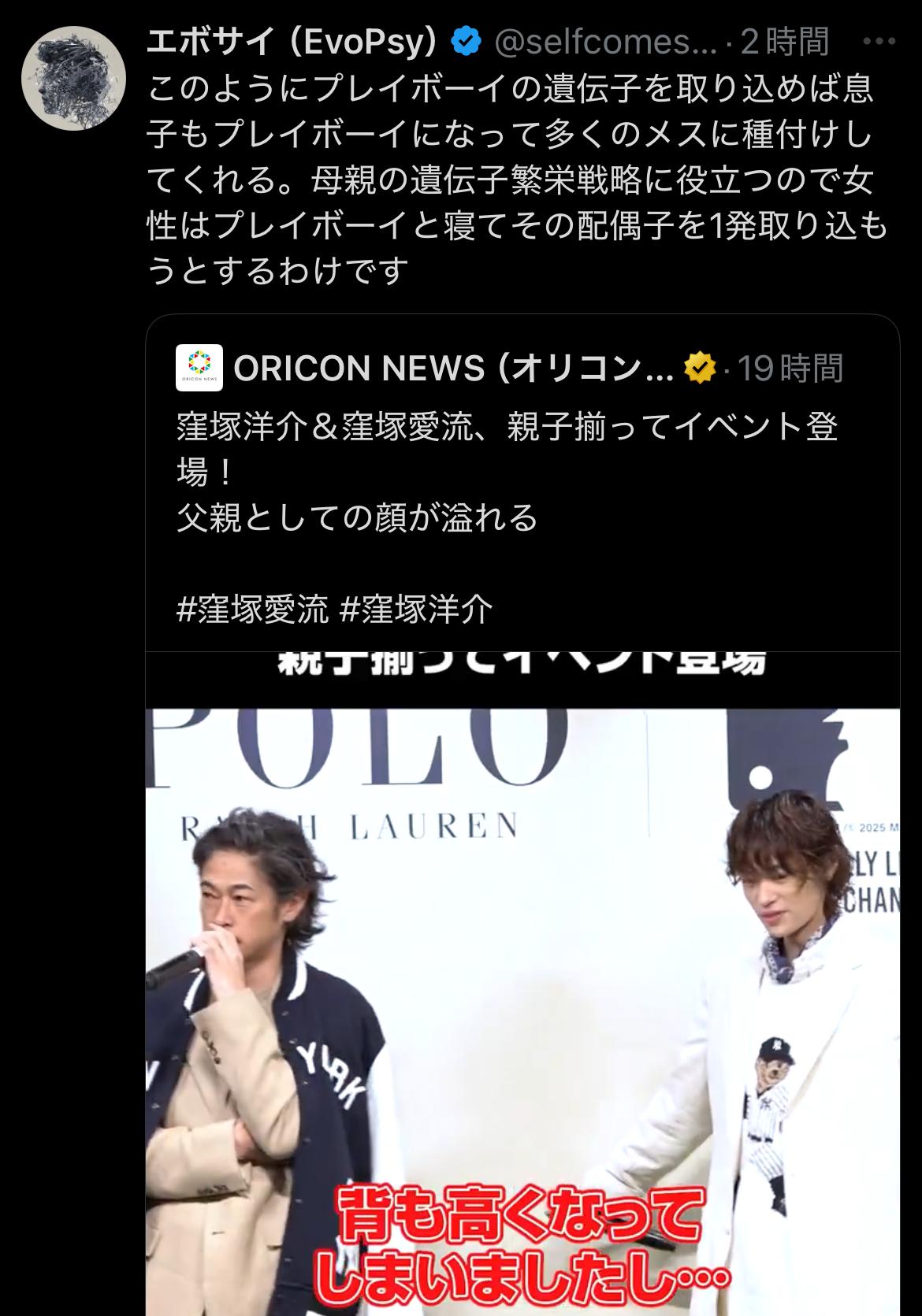 たとえイケメンじゃなくても親が強者ならその遺伝子が受け継がれて不思議と女が寄ってくるからなあれなんなんだよ