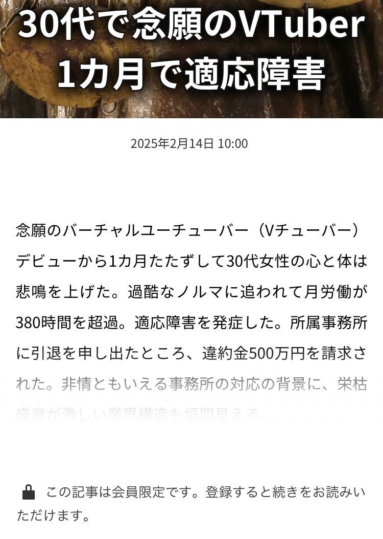 女性Vtuber、過酷なノルマに追われ月380時間の労働で適応障害を発症。事務所に引退を申し出るも500万円の違約金を請求される