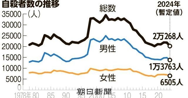 - 2024年の自殺者数(暫定値)は2万268人で、前年の確定値と比べると1569人(7.2%)減った。厚生労働省が29日、発表した。減少は2年連続。一方、小中高生の自殺は527人で統計のある1980年以降、過去最多となった。