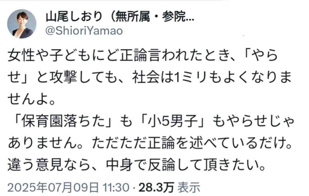 無所属で東京選挙区から出馬した山尾志桜里氏によるSNS投稿が波紋を広げている。