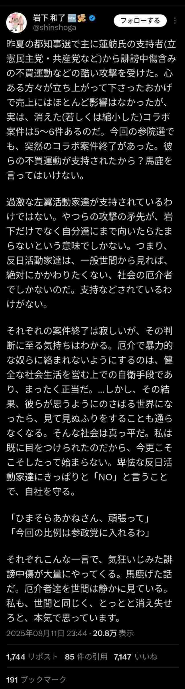岩下の新生姜「助けて!!!暇空茜と参政党支持したり大学生中傷したら他の会社とのコラボ商品キャンセルされまくったの!!!」