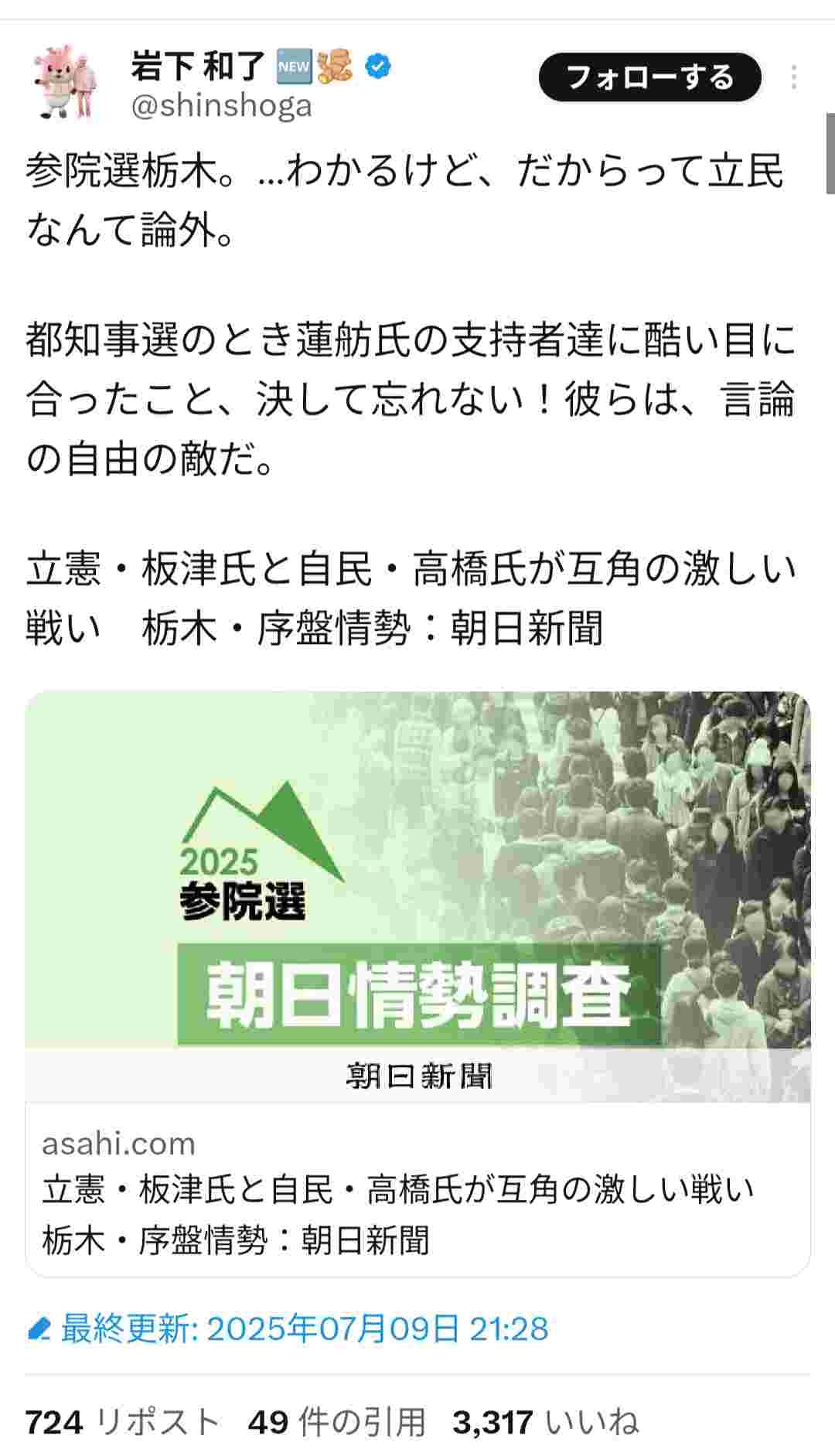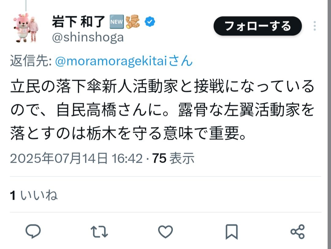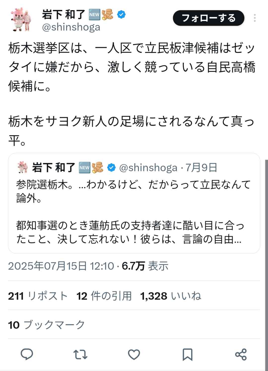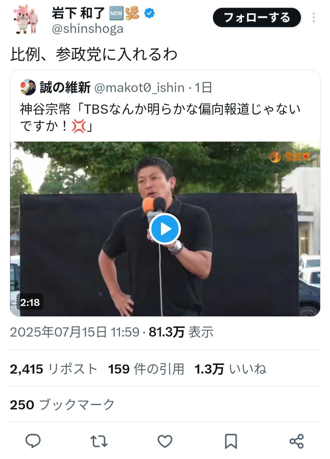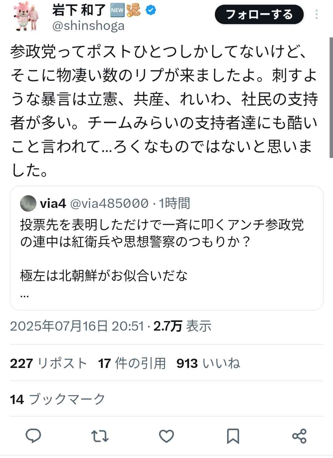 岩下の新生姜「参政党に投票すると発言したら大量に誹謗中傷された!刺すような暴言は立憲、共産、れいわ、社民の支持者が多い」