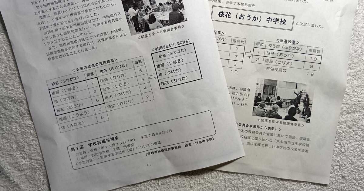 白光中(同市椿黒町)と甘木中(同市甘木)が統合される。両校長やPTAらでつくる学校再編協議会が9月に生徒や住民らから案を募り、寄せられた340件について議論と投票を重ねて決めた。当該校の生徒2人による案と言い、「桜のように生徒が個性を輝かせ、充実した学校生活を送ってほしい」と思いを込めた。現校名や地名と関連はない。12月22日の市教育委で審議され、2026年2月市議会で採決される予定。