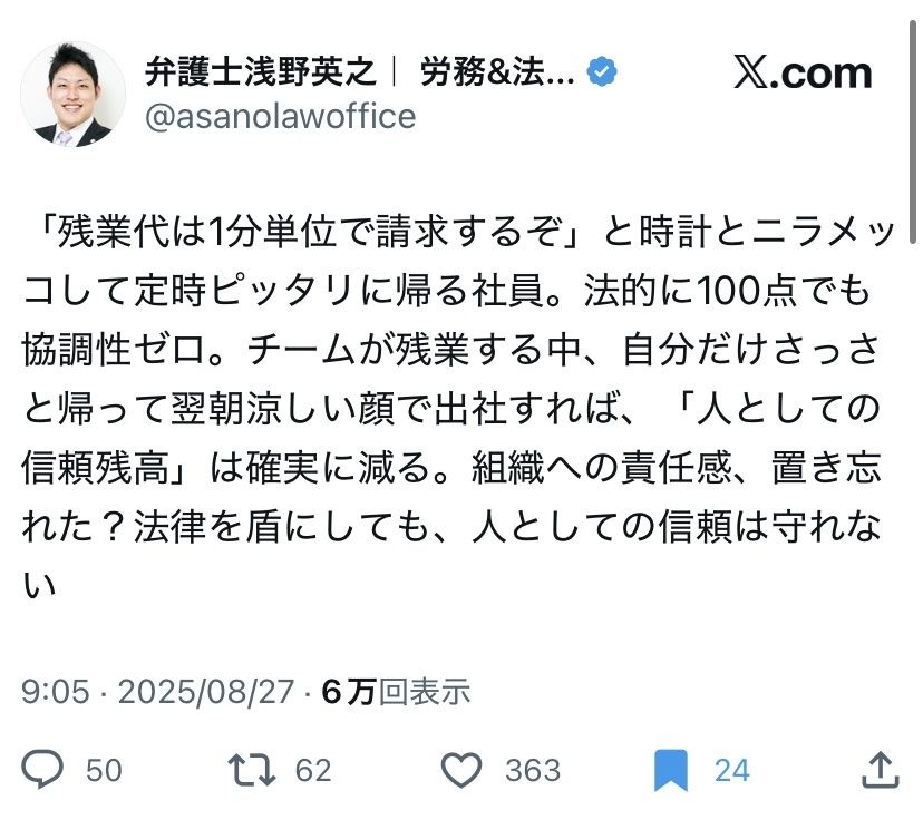 弁護士「定時ピッタリに帰る社員。法的に100点でも協調性は0。人としての信頼残高が確実に減ってます」