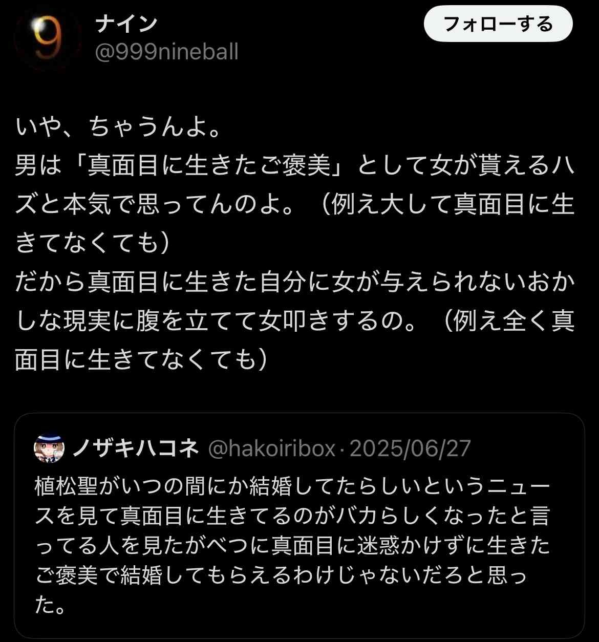 そもそも「真面目に生きてるのがバカらしくなった」を「真面目に生きたらご褒美で結婚できると思っている人」と解釈してるのも意味わからんし - 21 : 2025/07/17(木) 09:20:03.309 ID:u5/elurD0