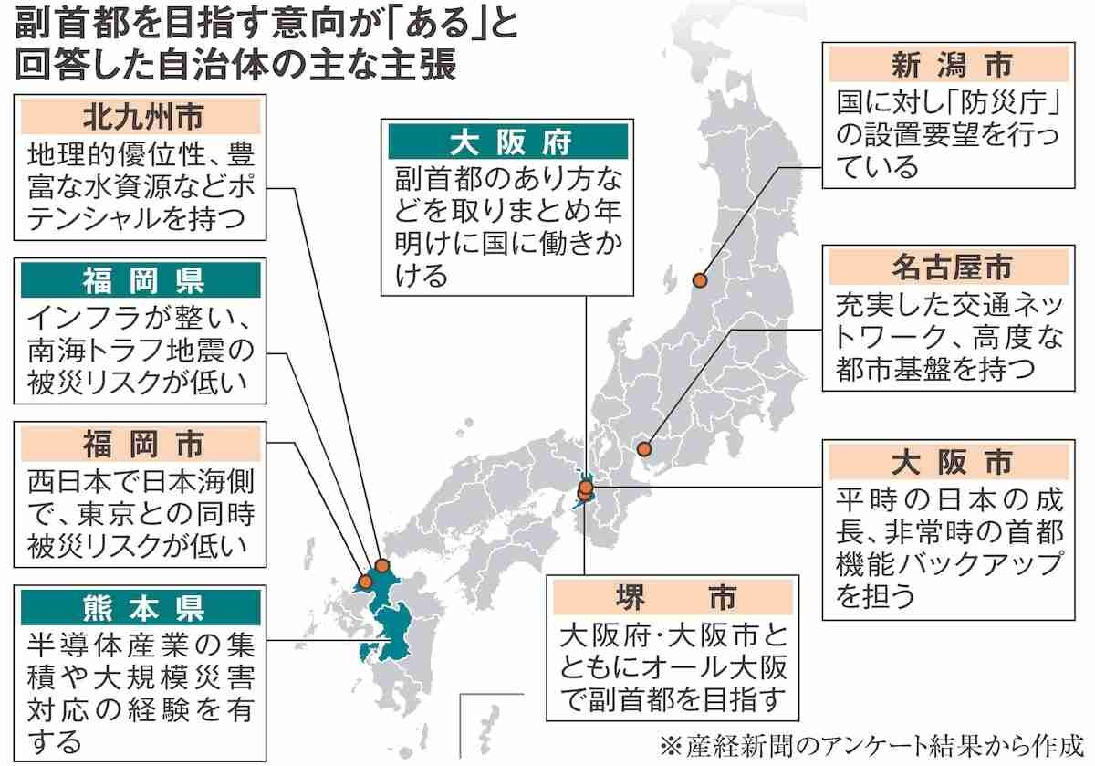 アンケートで副首都を目指す意向が「ある」と答えた9自治体は新潟、名古屋、大阪、堺、北九州、福岡の6市と大阪、福岡、熊本の3府県。名古屋市が充実した交通ネットワークや高度な都市基盤を備えているとする一方、新潟市や福岡市などは首都圏との同時被災リスクが低い点に言及。熊本県は、経済の牽引(けんいん)役となる半導体産業の集積地であるほか、大規模災害対応の経験があり「役割を担える可能性がある」とした。