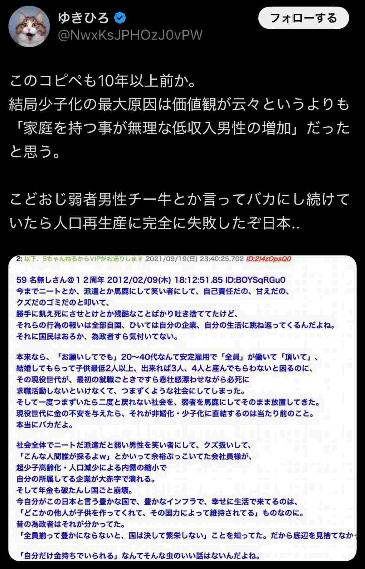 平成中期までは独身は一人前じゃないとか変わってる奴とかそういう扱い受けてたからお見合いとかしてチー牛も無理やり結婚してたけど今や多様性の時代で独身でも何も思われないから「ほな結婚せんでええわ」っていうチー牛が増えとるんや。昭和の出生率の高さはそうやってチー牛に無理させて傘増しした数字でしかなく、今その揺り戻しが来てるだけ