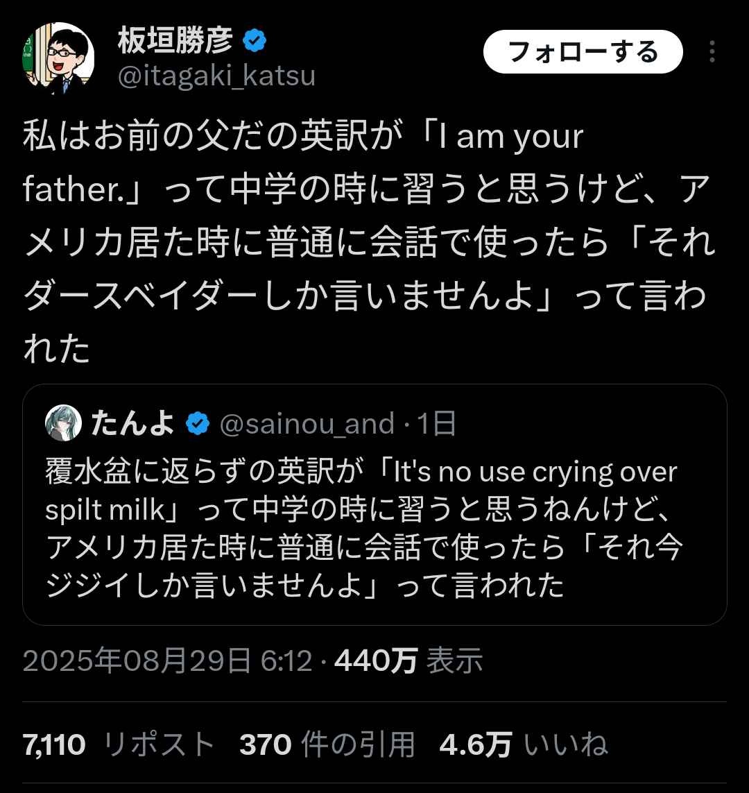 “I am your father”なんて英語の教科書に出てきたか?