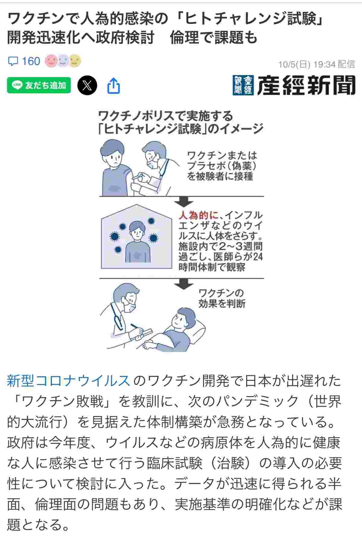 ワクチンで人為的感染の「ヒトチャレンジ試験」 開発迅速化へ政府検討 倫理で課題も(産経新聞) - Yahoo!ニュース新型コロナウイルスのワクチン開発で日本が出遅れた「ワクチン敗戦」を教訓に、次のパンデミック(世界的大流行)を見据えた体制構築が急務となっている。政府は今年度、ウイルスなどの病原体を人為的に健康な人にnews.yahoo.co.jp - 2 : 2025/10/06(月) 13:54:45.32 ID:/5+WRn7J0
