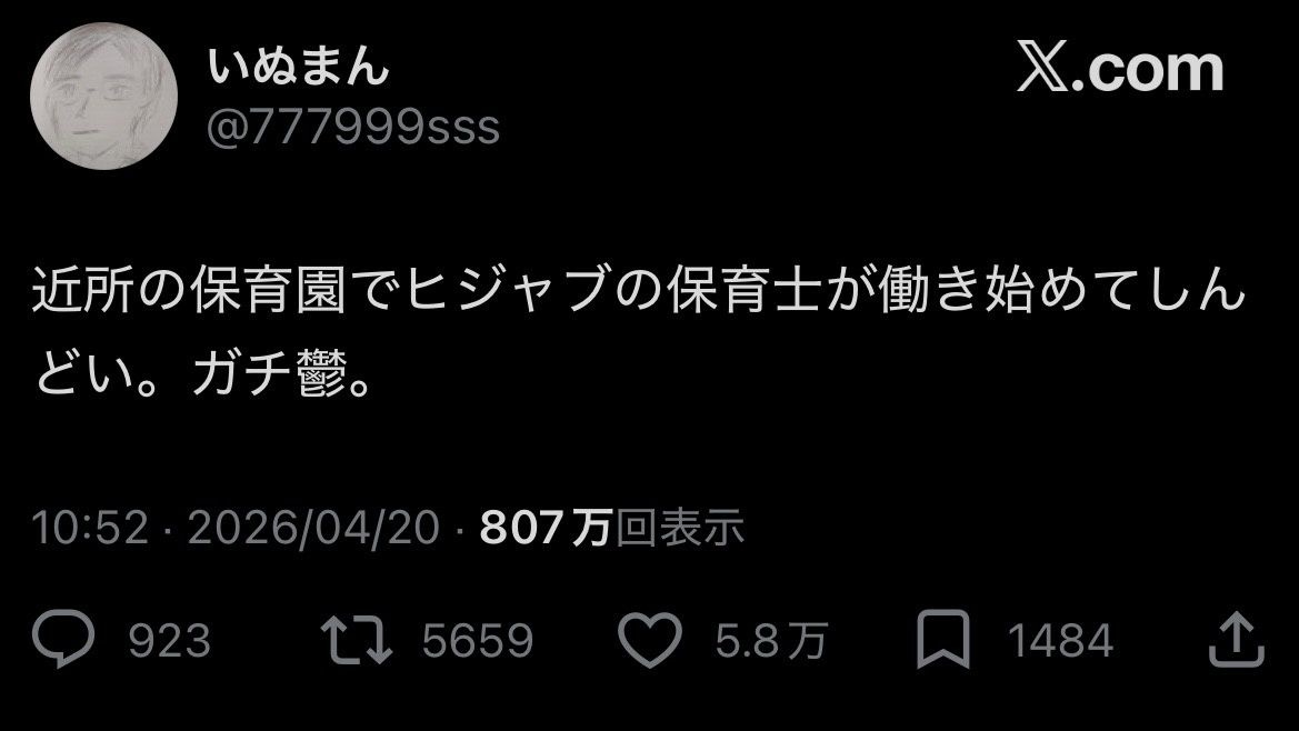 普通の日本人🇯🇵「近所の保育園でイスラム教徒の保育士が働き始めて鬱」←5万いいね