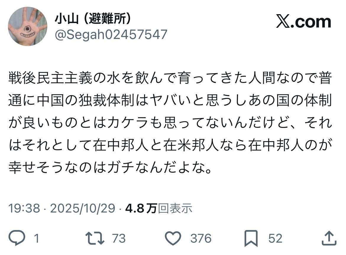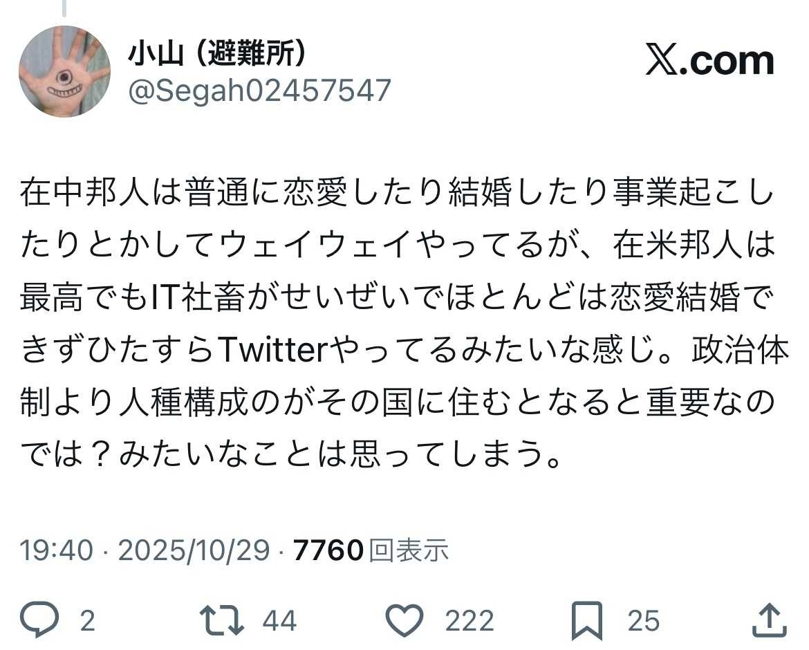 国の体制はともかく露骨な差別とかは中国の方が少なそうではある - 58 : 2025/10/30(木) 20:44:23.78 ID:Oa5lPJXm0