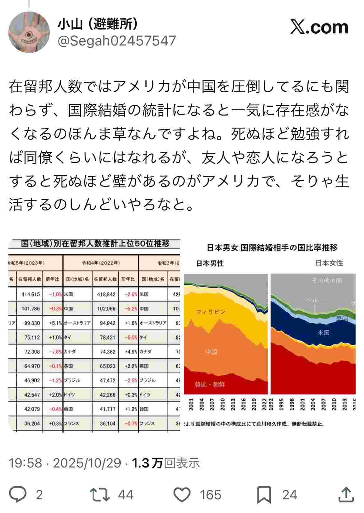 アメリカと中国の現地の日本人の結婚に限定しないと分からんよ - 53 : 2025/10/30(木) 20:40:48.46 ID:Y/zhiWmj0