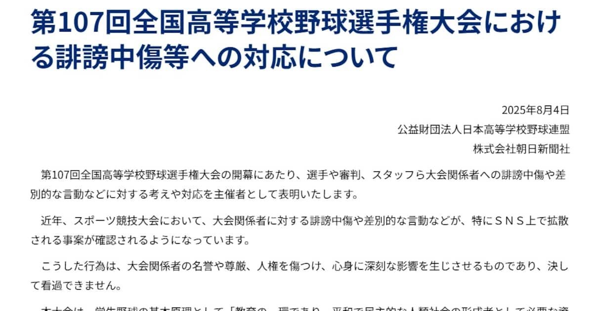 日本高野連、SNSでの選手らへの誹謗中傷に「毅然とした対応」と表明 法的措置も含め甲子園球場(兵庫県西宮市)で5日に開幕する第107回全国高校野球選手権大会を巡り、主催する日本高野連と朝日新聞社は4日、選手や関係者に対する主にSNSでの誹謗…www.sankei.com - 2 : 2025/08/09(土) 19:58:25.40 ID:r3D7iLxj0