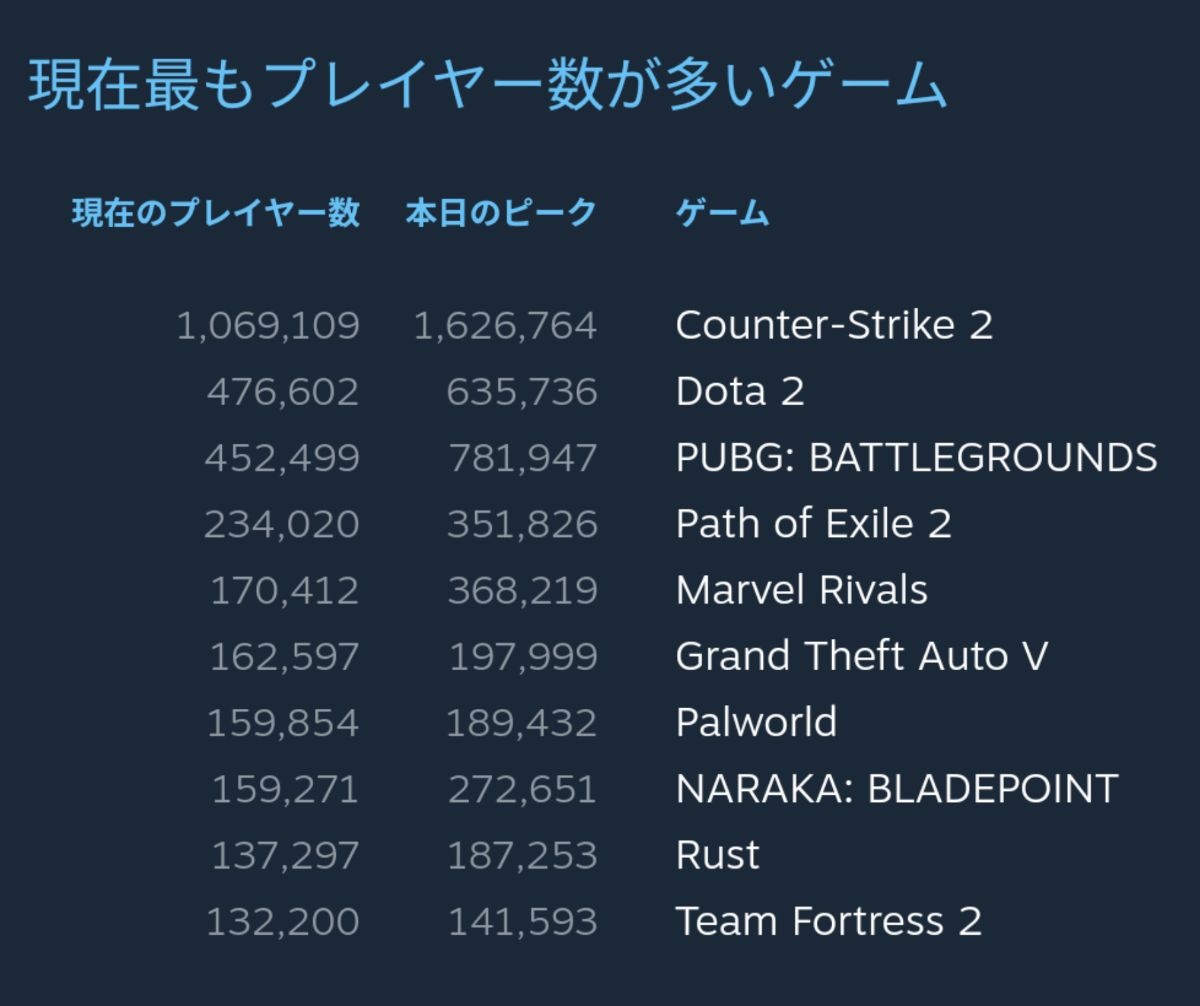 本日のSteam同接ランキングwww