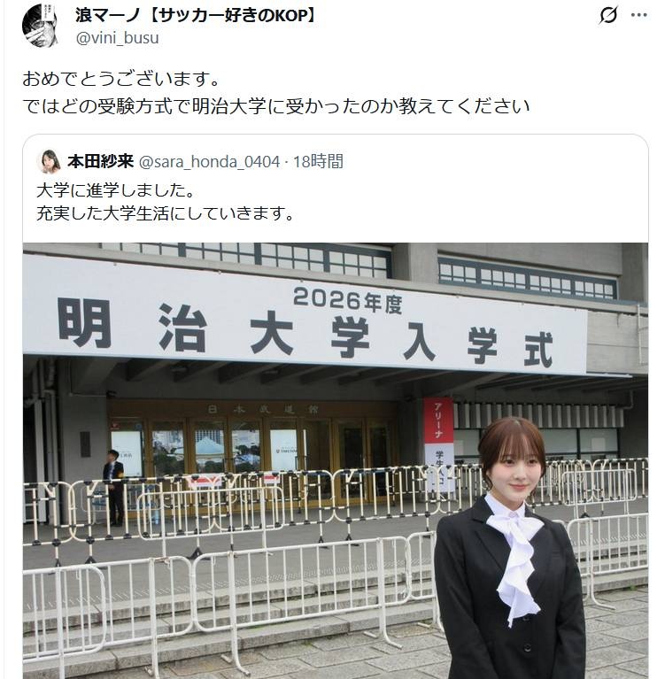 本田紗来「大学入学しました!」X「ではどの受験方式で受かったのか教えてくれます?(ニチャア」