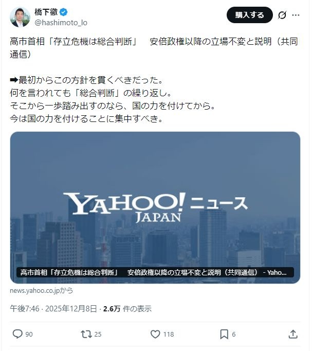 橋下徹「存立危機の判断は「総合判断」で一貫すべきだった、一歩踏み出すのなら国の力を付けろ」高市首相「存立危機は総合判断」