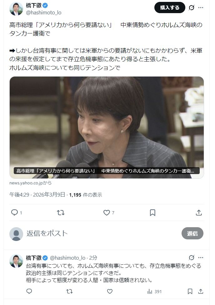 橋下徹「高市は台湾でもイランでも同様の存立危機事態の政治的主張をしろ、相手によって態度が変わる人間は信頼されない