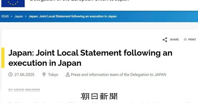 - 法務省が2年11カ月ぶりの死刑を執行したことを受け、在日欧州連合(EU)代表部などは、「遺憾の意」を表明し、モラトリアム(執行停止)の導入を求める共同声明を出した。