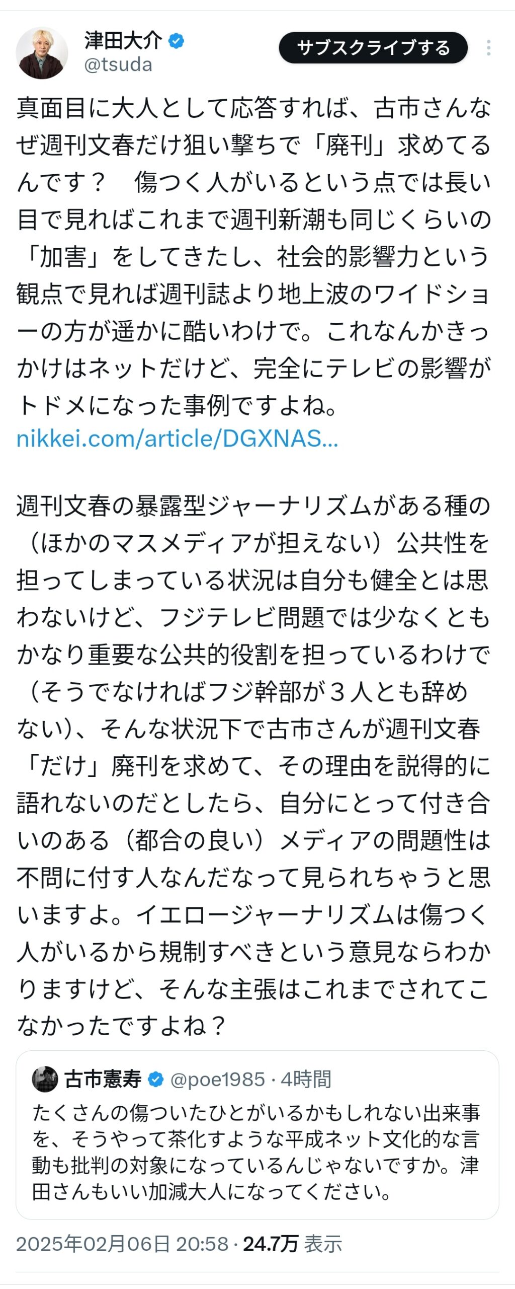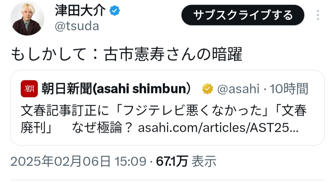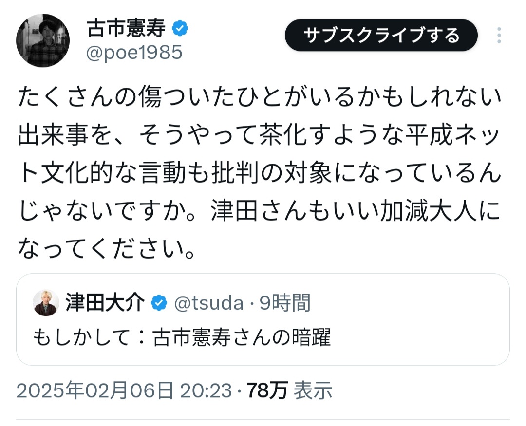 津田大介「古市さんは、なぜ文春だけに廃刊を求めているの?理由を語らないって事は、自分に都合の良いメディアは不問に付す人って事?」