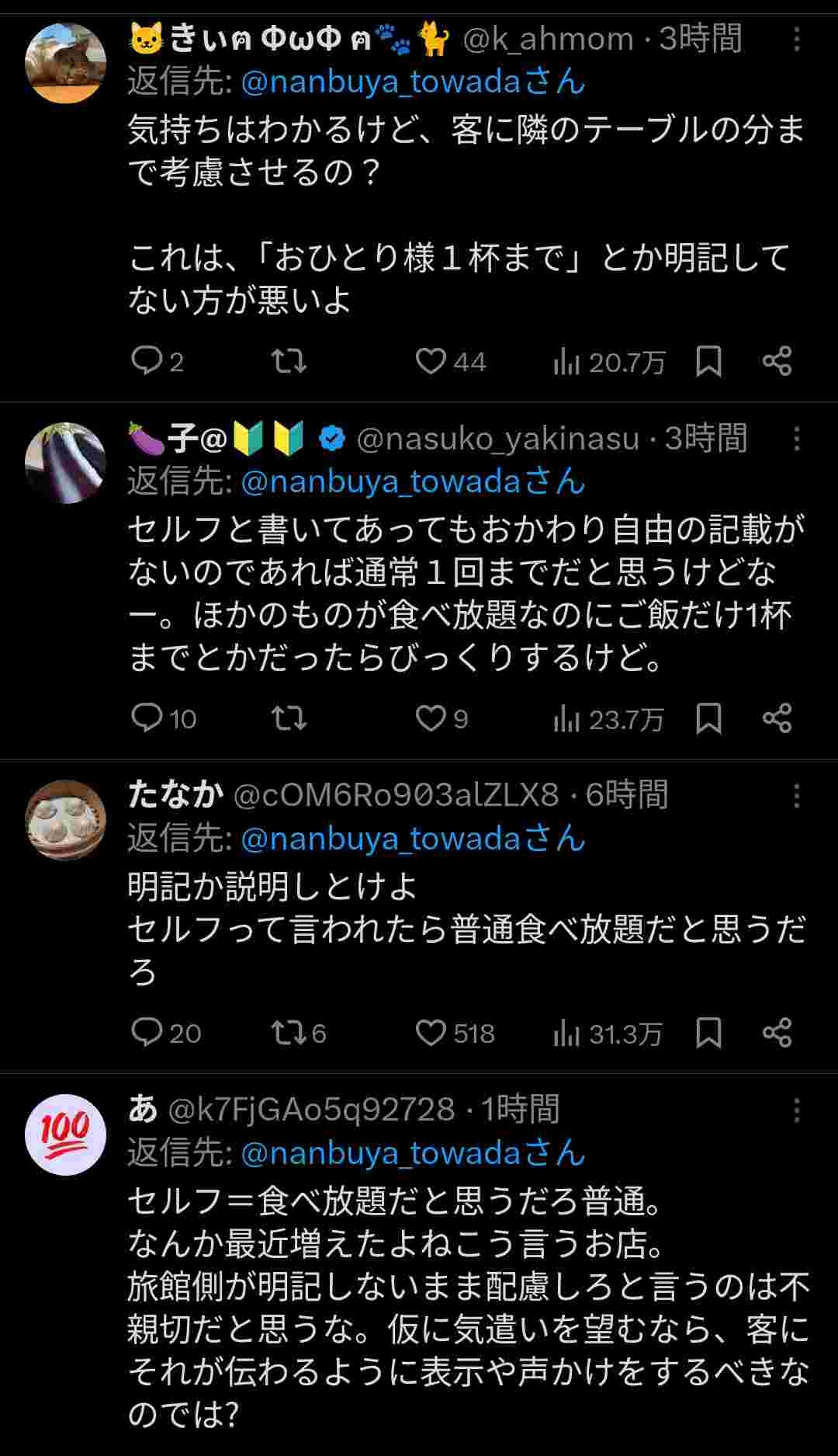 温泉民宿「ご飯の『セルフで』は『食べ放題』って意味じゃないんだよ、バクバク食うのやめてくれ」→Xで議論になる