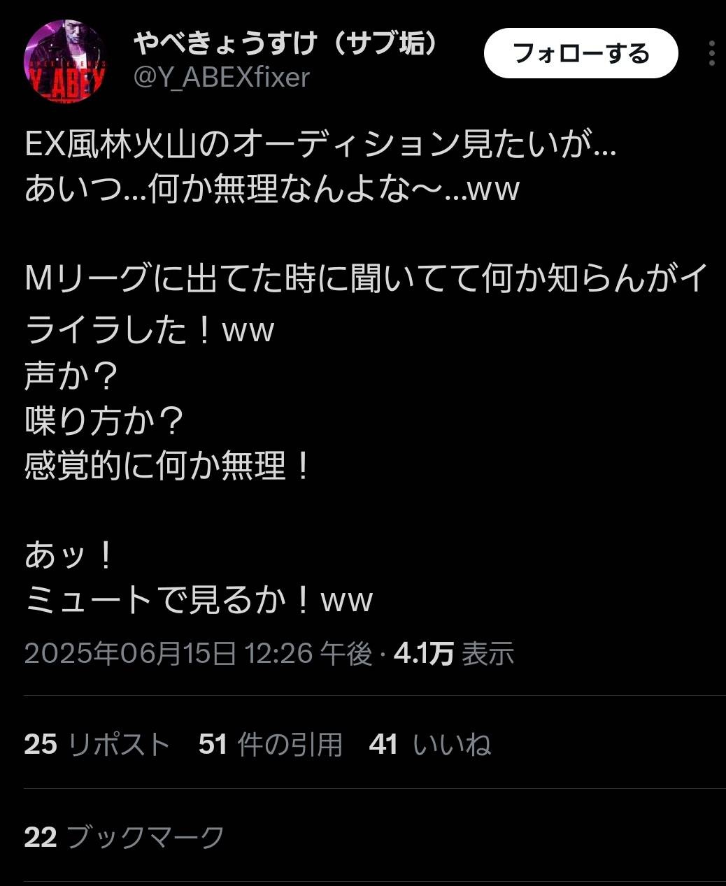- やべきょうすけとかいう51歳の熱闘Mリーグにも出てるようなおっさんが、麻雀プロの解説者石井一馬に対してXで暴言と誹謗中傷
