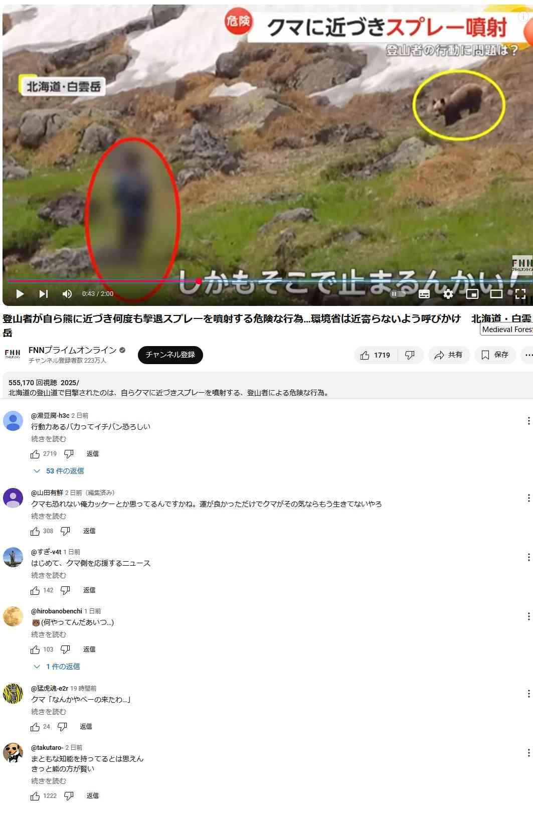 - 自分から向かって行ってクマ刺激してるだけ。この距離じゃスプレーも効果薄いし下手したら逆襲されるだけ。こんなバカ叩かれて当然