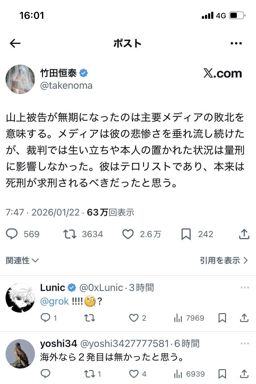 候補者でもない応援演説の聖帝撃って死刑は辻褄が合わない - 16 : 2026/01/22(木) 16:38:03.60 ID:Y1nHyCrE0