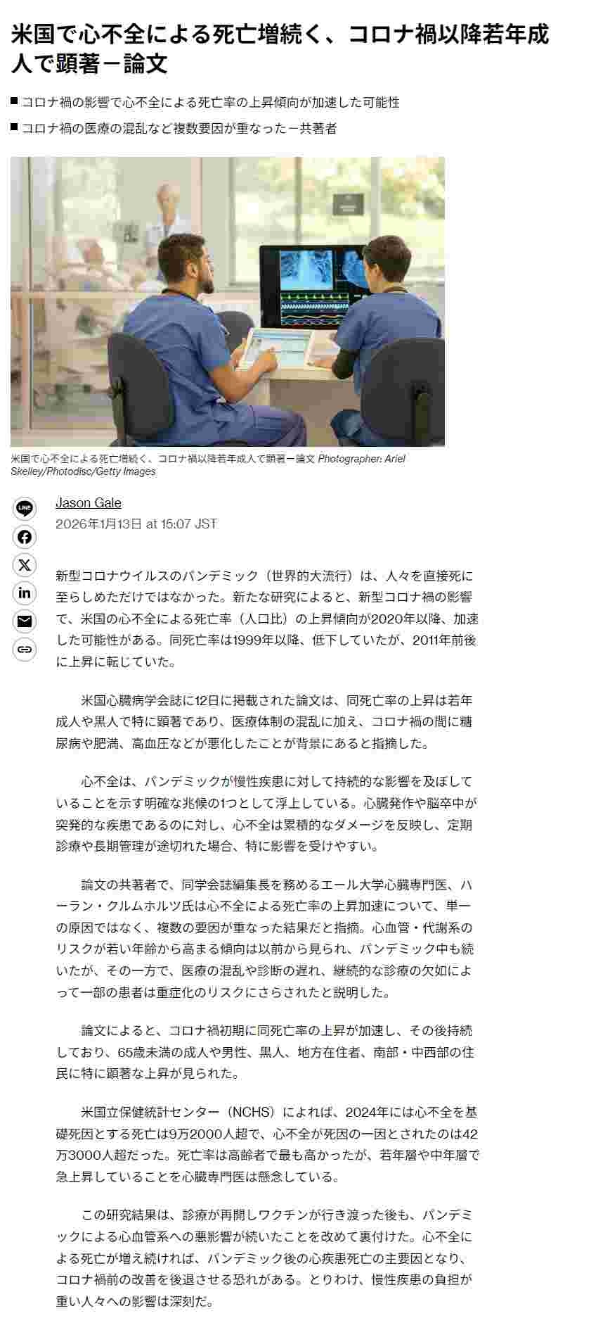 米国で心不全による死亡増続く、コロナ禍以降若年成人で顕著