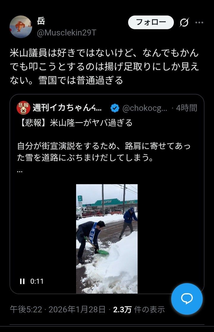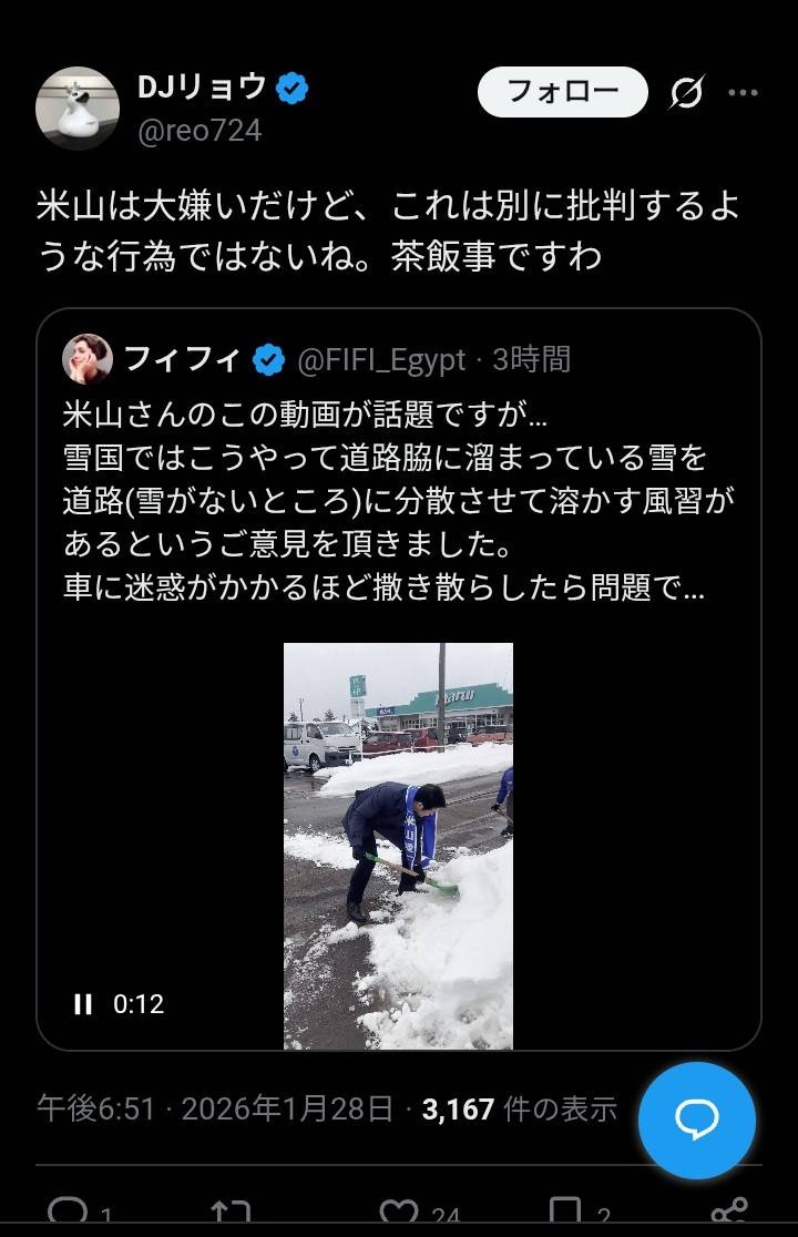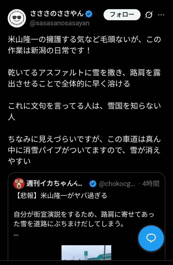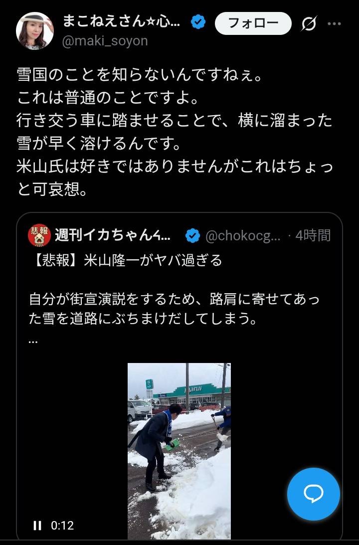 米山氏のアンチが次々に雪かき米山を擁護し始める…