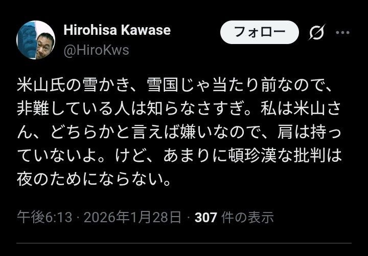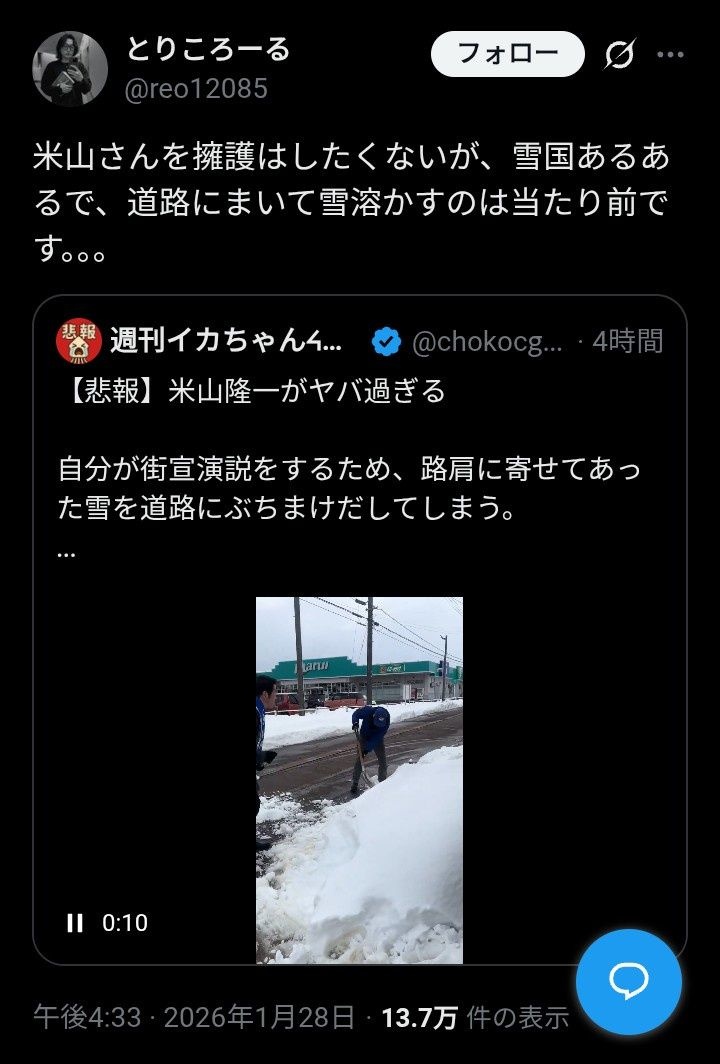 米山さんのことは好きだけど、道路に雪を捨てるとか絶対に許せない! - 37 : 2026/01/28(水) 20:27:09.04 ID:/Y1uuvub0